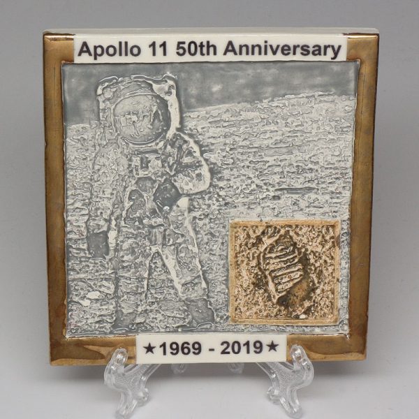 A 3D image of an astronaut walking in a spacesuit and the footprint of Buzz Aldrin in the moon dust of the lunar surface are depicted on the tiles. The area of the footprint is glazed using dust from the NWA 11273 Lunar Meteorite as the sole coloring ingredient. The borders of the tiles are overglazed in 22k gold to symbolize the golden anniversary of this historic event when men first left Earth and walked on the Moon.