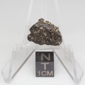 NWA14353 has a dark gray to dark brown exterior. Cut surfaces of the meteorite reveal a chondritic texture with abundant ellipsoidal light and dark colored chondrules and CAIs.
