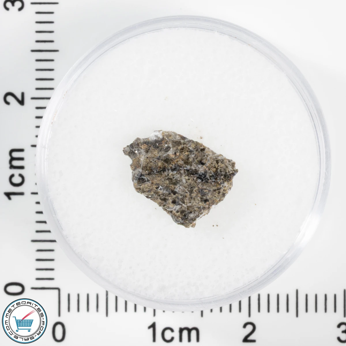 NWA 17472 meteorites have a weathered fusion crust. Broken fragments reveal an interior that is gray, with pyroxene crystals and maskelynite, which appears glassy and appears to sparkle in the light. This meteorite from Mars is also highly shocked.