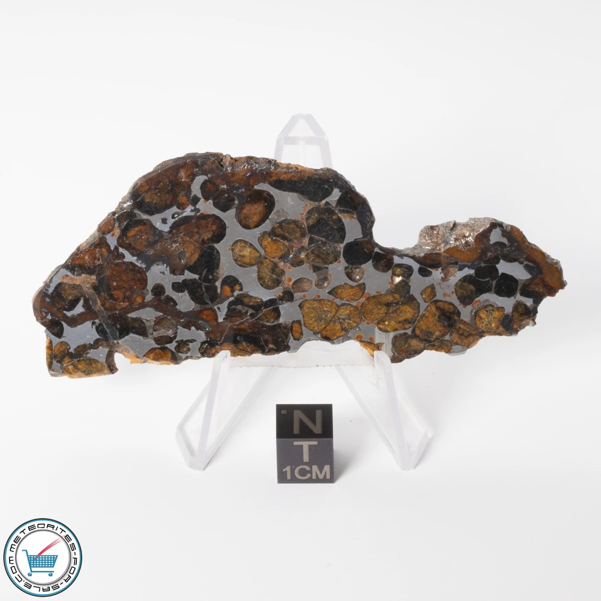 The Sericho pallasite meteorite was purchased in 2017 in Isiolo County, Kenya. These Sericho pallasite meteorite part and full slices are etched or polished and display beautiful olivine crystals. The olivine crystals of Sericho are generally rounded and vary in color from gemmy green to orange. The metal-rich areas of the Sericho pallasite show well-developed Widmanstätten patterns. The olivine crystals in these slices vary from light to dark but are not transparent.