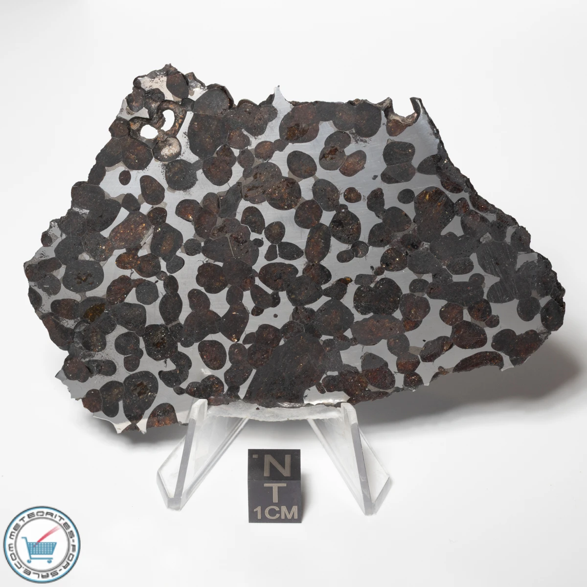 The Sericho pallasite meteorite was purchased in 2017 in Isiolo County, Kenya. These Sericho pallasite meteorite part and full slices are etched and display beautiful olivine crystals. The olivine crystals of Sericho are generally rounded and vary in color from gemmy green to orange. The metal-rich areas of the Sericho pallasite show well-developed Widmanstätten patterns. The olivine crystals in these slices vary from light to dark but are not transparent.
