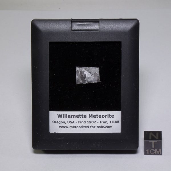 A beautiful display of Willamette meteorite related materials including an etched slice of Willamette meteorite, two small pieces of Willamette shale, a miniature cast of the remarkably shaped and sculptured Willamette Meteorite, and a reprint of the commemorative booklet written for the 60th anniversary of the discovery of the meteorite.