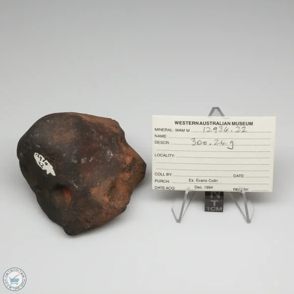 This Wiluna meteorite is a numbered museum specimen (12934.22) from the Western Australia Museum and comes with a Western Australian Museum specimen card. Paperwork is also provided from the Australian Government National Cultural Heritage Committee showing that this Wiluna meteorite specimen was legally exported from Australia.